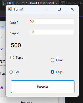 : “Hesapla” düğmesine tıklama olayının işlevi. Bu olay, kullanıcının girdiği iki sayıyı ve seçilen aritmetik işlem türünü temel alır.float sayi1 = Convert.ToSingle(txtSayi1.Text);
