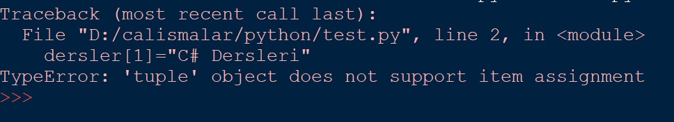 1 2 3 4 | dersler = ("Python Dersleri", "C++ Dersleri", "Java Dersleri") dersler[1]="C# Dersleri" |