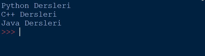 1 2 3 4 5 | dersler = ("Python Dersleri", "C++ Dersleri", "Java Dersleri") for eleman in dersler: print (eleman) |