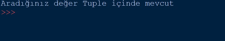 1 2 3 4 5 | dersler = ("Python Dersleri", "C++ Dersleri", "Java Dersleri") if "Python Dersleri" in dersler: print("Aradığınız değer Tuple içinde mevcut") |