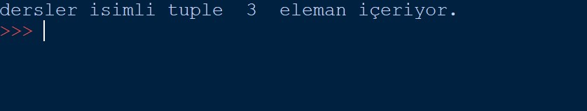 1 2 3 4 5 | dersler = ("Python Dersleri", "C++ Dersleri", "Java Dersleri") adet=(len(dersler)) print("dersler isimli tuple ",adet," eleman içeriyor.") |