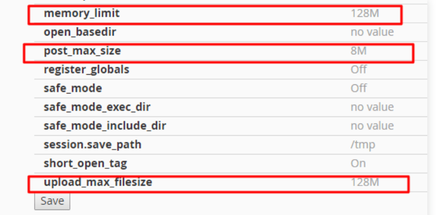 1 2 3 4 5 6 7 | php_value memory_limit 128M php_value upload_max_filesize 64M php_value post_max_size 64M |